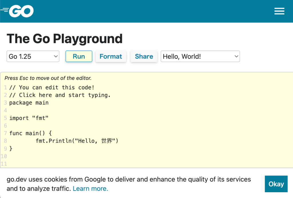 Go言語どんなものか見てみたい方は、こちら↓から動かせます(画像をクリックしてね)。Runボタンを押すとプログラムが実行されます。